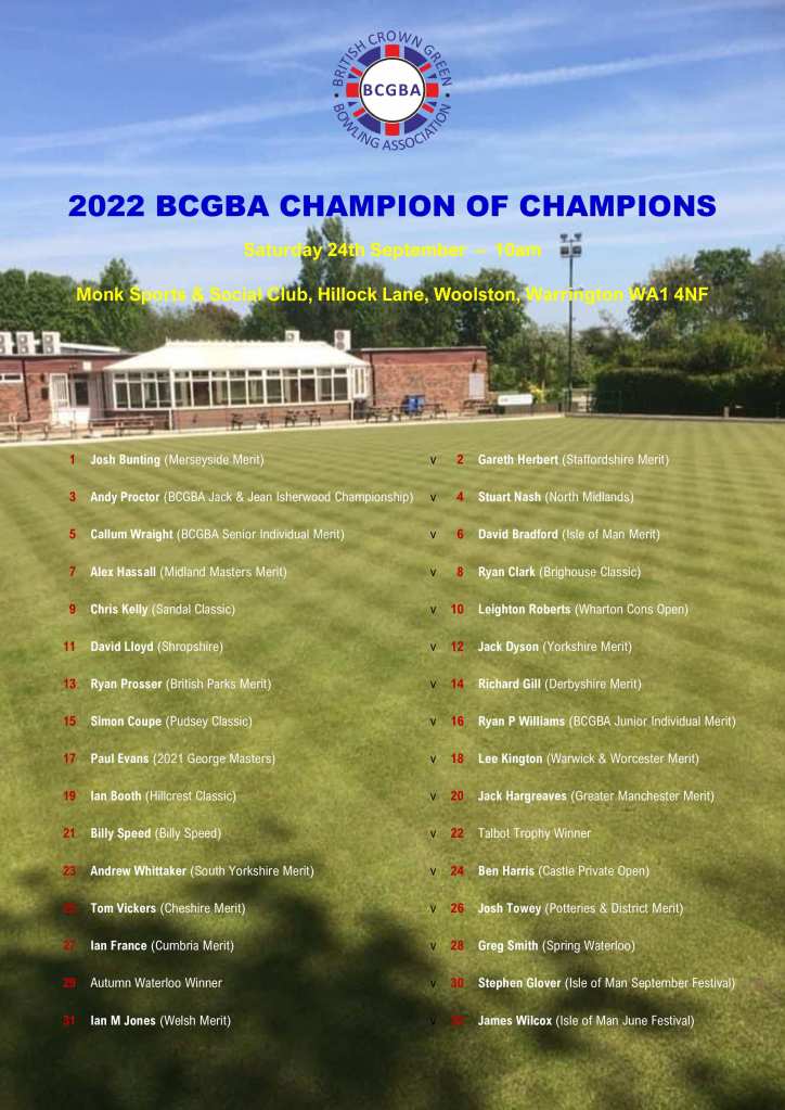 The Champion of Champions competition is to be held at Monk Sports & Social Club, Warrington, next Saturday. Play starts at 10am. The draw and address are shown on the flyer below. It promises to be a great day’s bowling.
